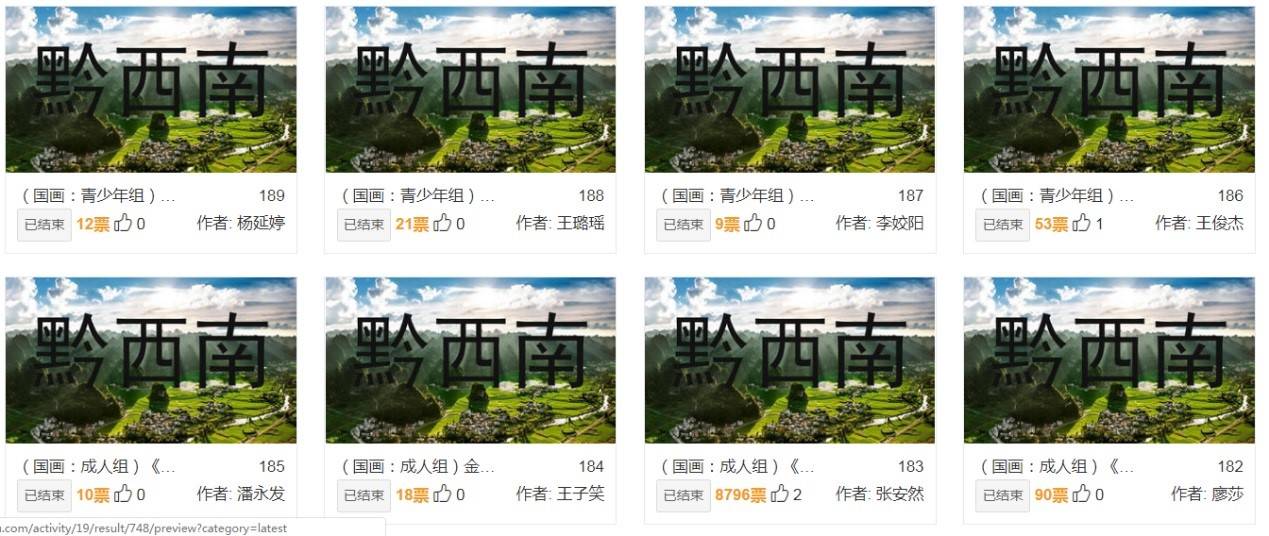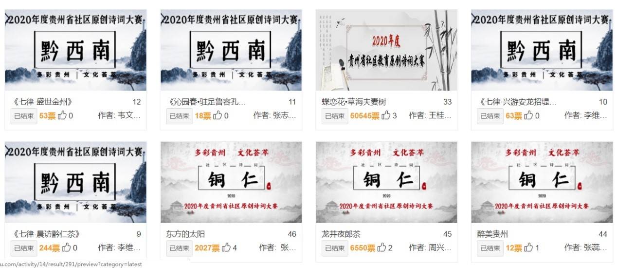 通知下发后,各相关单位和部门积极响应、迅速行动、精心谋划,于2020年6月全面启动,历时5个月,在全省范围内组织实施了以“多彩贵州 文化荟萃”为主题,以原创诗词、摄影作品、书画作品为载体,展现贵州山水之美和风土人情,记录贵州经济社会发展取得的巨大成就,积极引导社区居民践行社会主义核心价值观,弘扬“团结奋进、拼搏创新、苦干实干、后发赶超”的新时代贵州精神。此次大赛共收到近千个作品,百余万人次通过乐之学习网——贵州社区教育学习平台参与线上投票。经过初赛、复赛、网上投票、专家打分等环节,产生一等奖作品25个,二等奖作品65个,三等奖作品110个,优秀组织单位18个,组织工作先进个人27名。贵州省2020年全民终身学习活动周开幕式上将对获奖单位和个人予以表彰,并展示部分获奖作品。