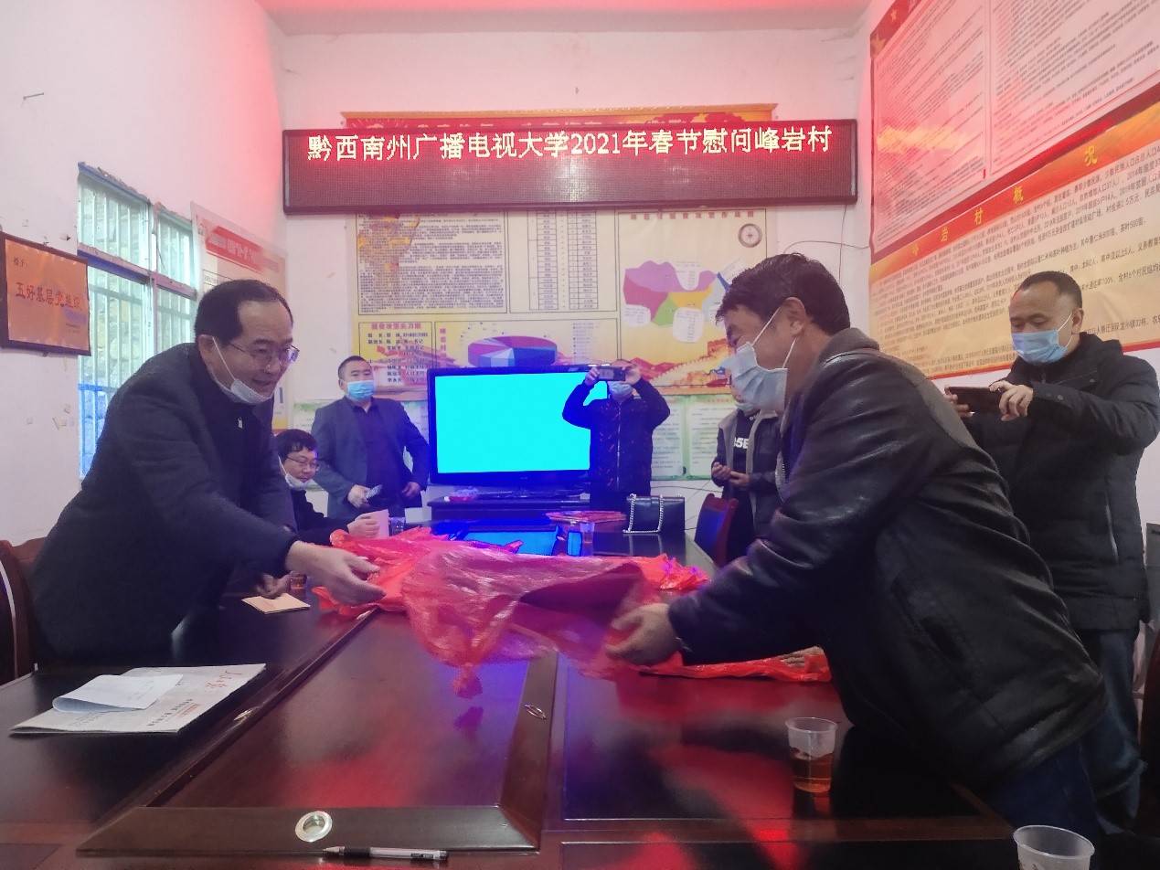 2月3日(农历腊月22日)上午,黔西南州电大党委副书记、校长傅强同志率慰问组冒着严寒来到学校扶贫点——安龙县洒雨镇峰岩村和格红村进行2021年春节慰问。学校领导傅强、解天录、封怀忠同志深入实际,认真调研峰岩村和格红村目前的社会生产和群众生活情况,同时,为峰岩村和格红村的群众送春联,一幅幅大红春联饱含深情,祝福村民过上幸福生活,受到群众的热烈欢迎!