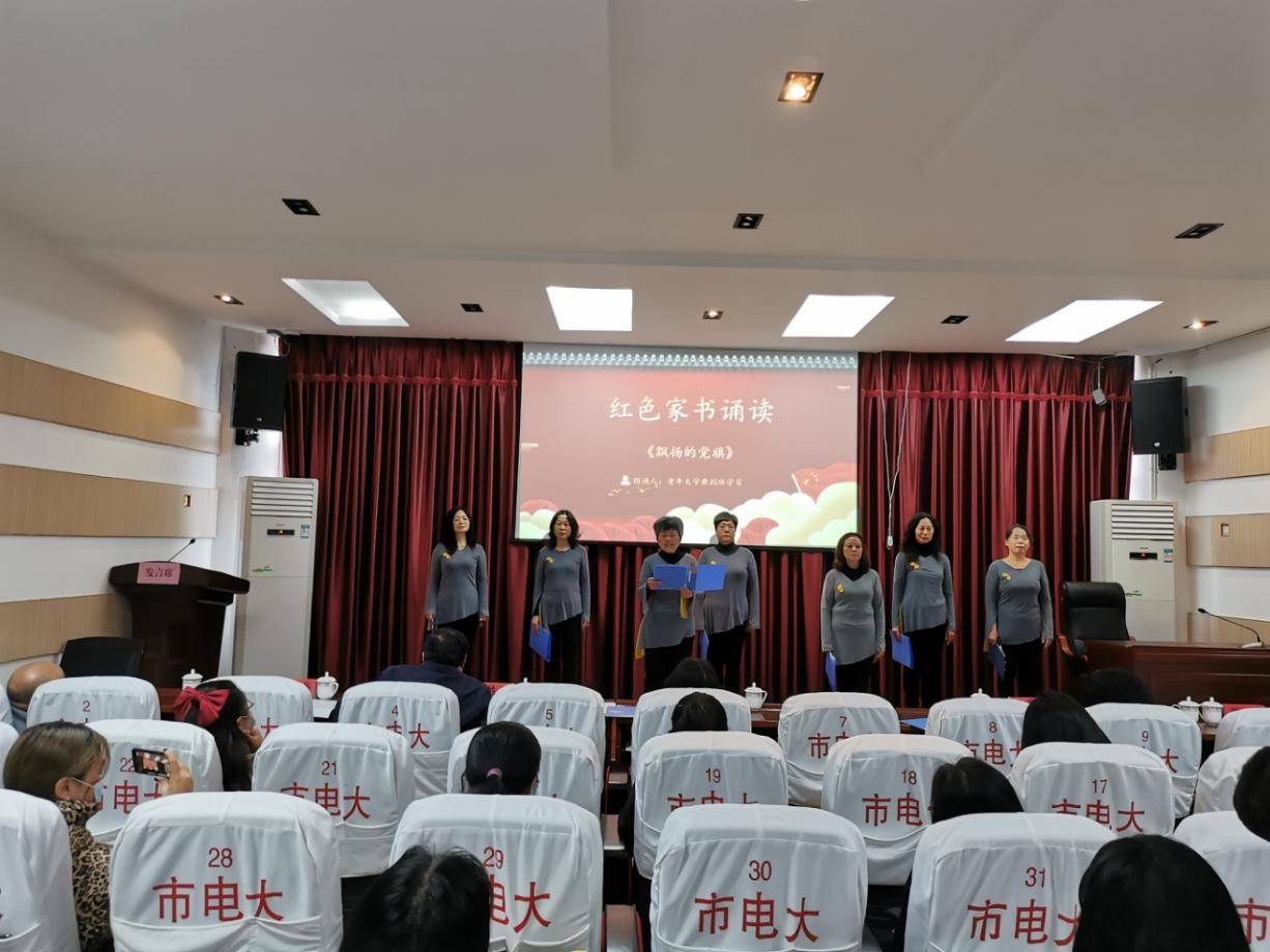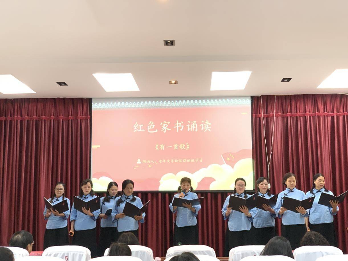 第二阶段的诵读环节,由安顺电大教师洪典若、郭荣莉主持,安顺电大教师、安顺电大老年大学分校诗歌朗诵班学员、安顺电大老年大学分校舞蹈班学员、学苑社区代表们分别表演了红色家书朗诵节目《有一首歌》、《飘扬的党旗》、《红色家书》、《抗日女英雄赵一曼家书》、《刘胡兰的故事》和安顺电大书记校长徐敏带领部分教师和老年大学学员共同诵读《回望峥嵘岁月 感受信仰力量》。诵读者们声情并茂、精神饱满、充满激情,以真切朴实的情感讲述了家书背后的感人故事,表达了对烈士们的敬仰和爱戴之情;一封封红色家书的诵读,一字字、一句句都饱含着穿透人心、力透纸背、热血澎湃、跨越时空的磅礴力量。通过诵读,再一次将革命烈士们对中国共产党的坚定信仰和不屈不挠、勇于斗争的革命精神作了深入人心的颂扬和宣传。