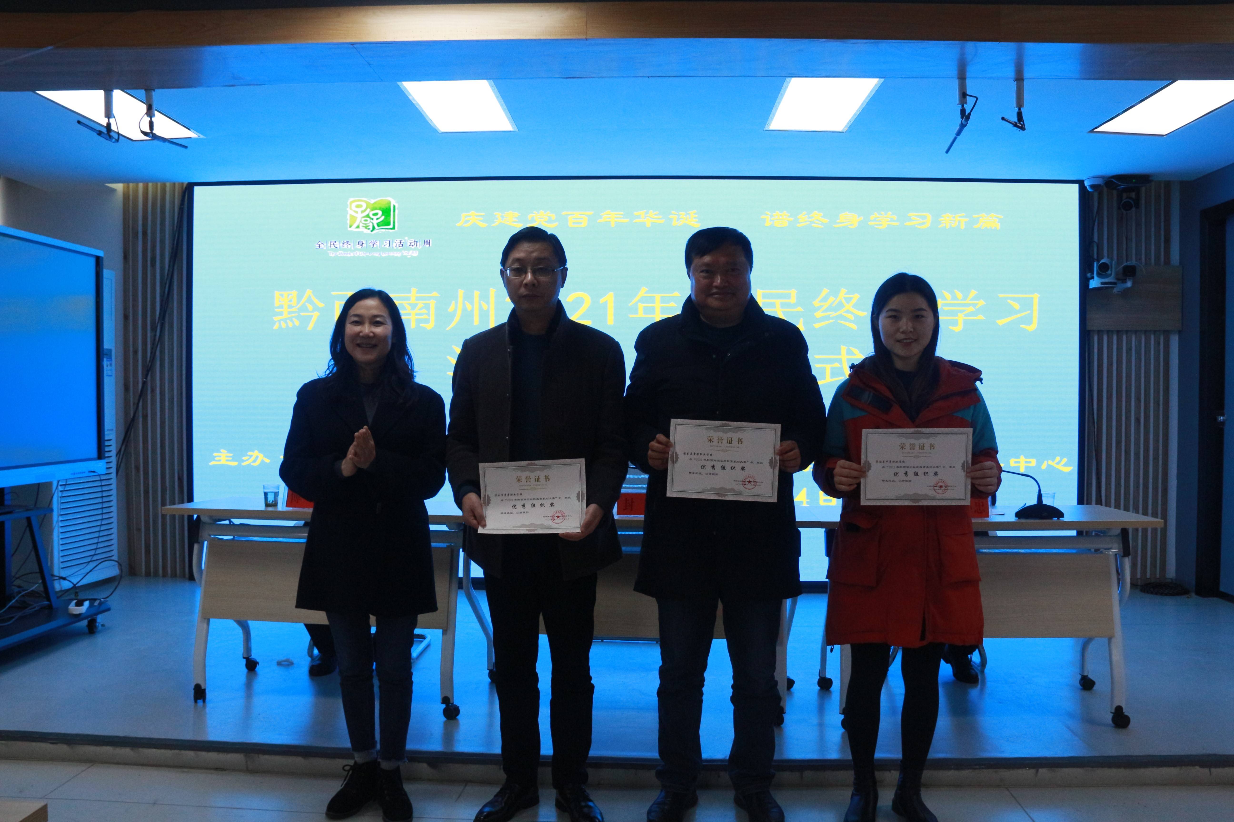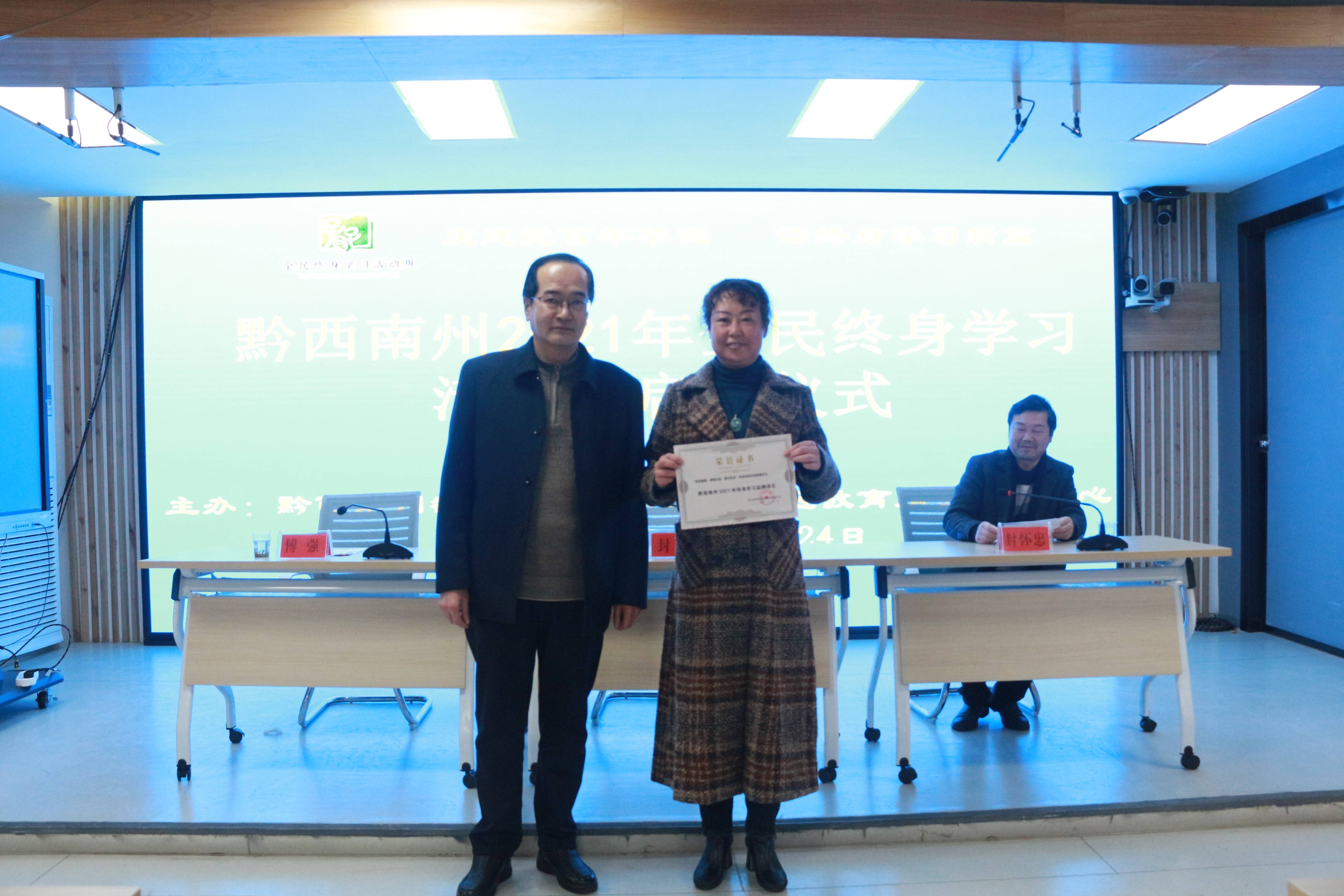会上,黔西南州广播电视大学校长、黔西南州社区教育指导服务中心主任傅强同志宣读《关于确定贵州省2021年“百姓学习之星”和“终身学习品牌项目”名单的通知》《关于公布黔西南州2021年“百姓学习之星”、“终身学习品牌项目”、社区教育系列大赛评选结果的通知》;参会领导为获得“百姓学习之星”“终身学习品牌项目”“2021年社区教育系列大赛”获奖代表颁发荣誉证书;黔西南州教育局党组成员、教育工会主席封蠡同志讲话并宣布黔西南州2021年“全民终身学习活动周”正式启动。