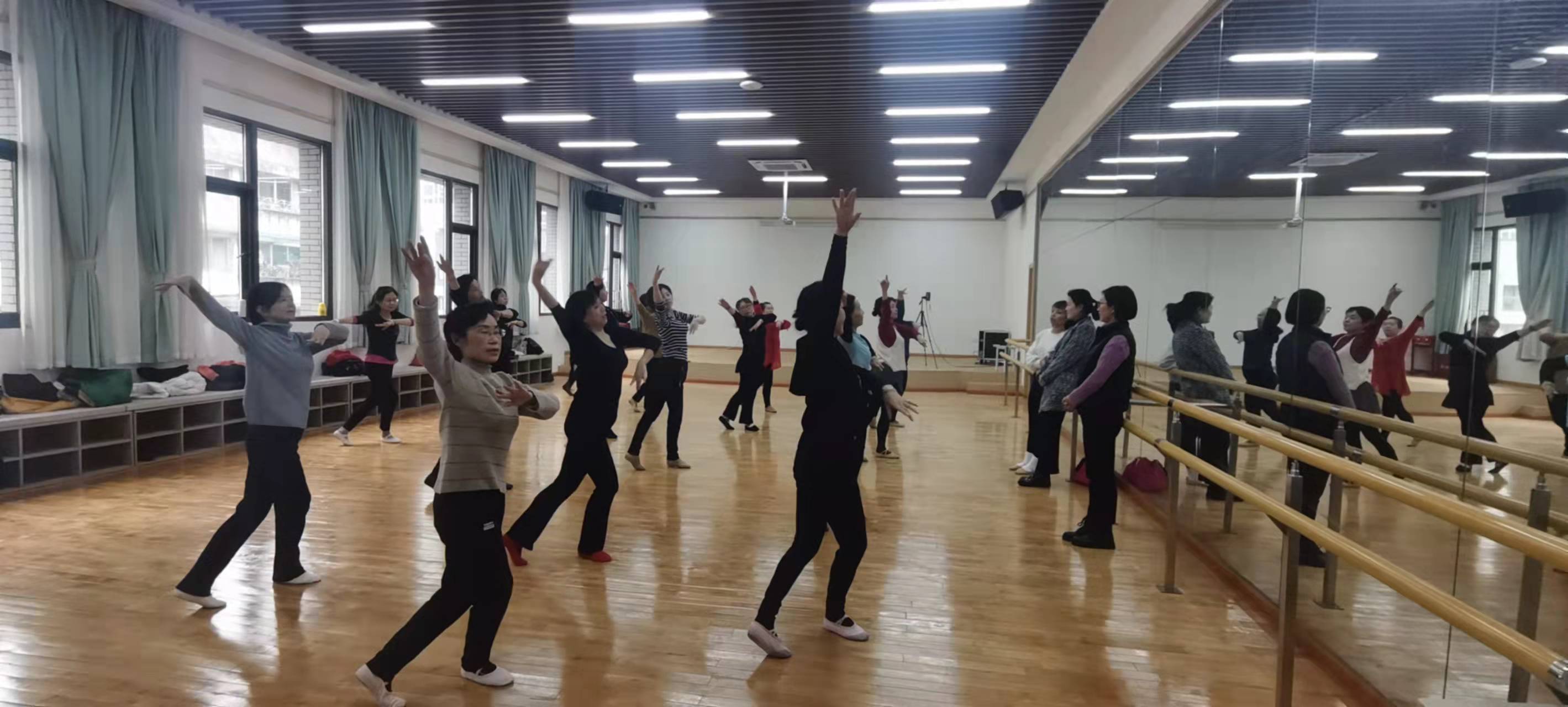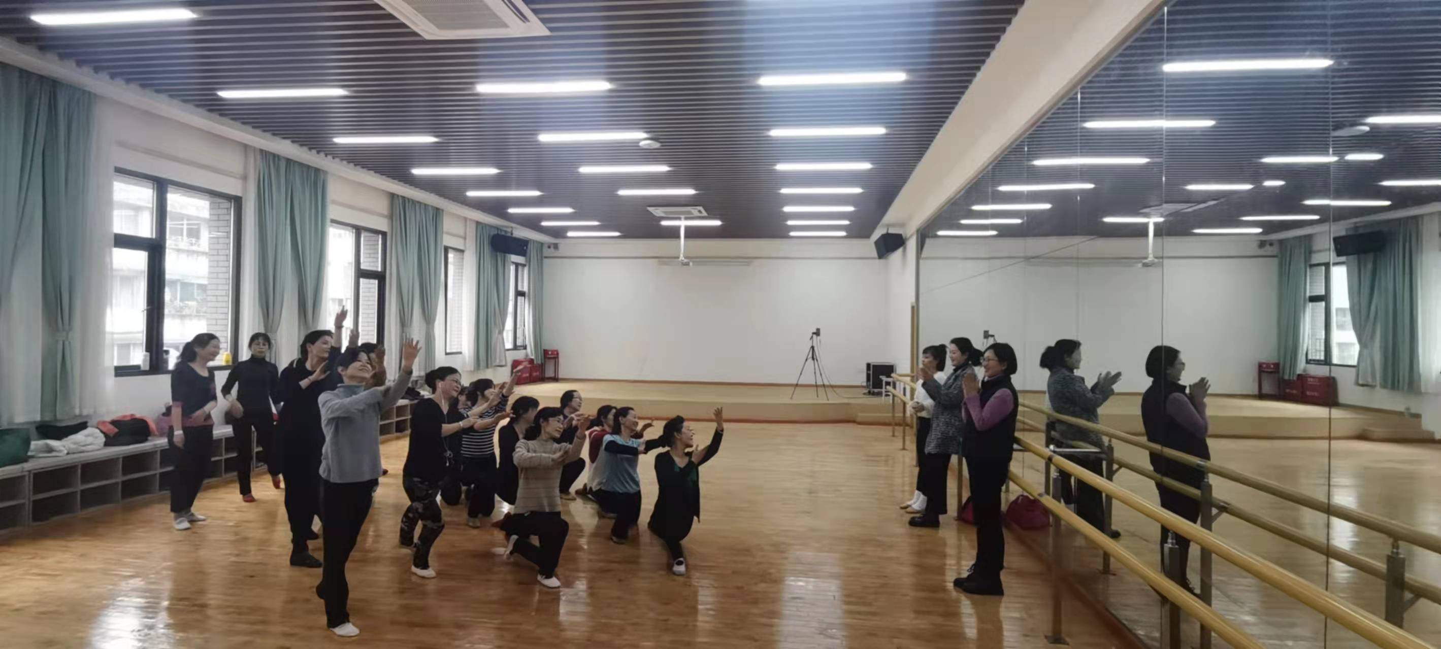 由贵州省社区教育指导服务中心副主任涂雪霏(主持工作)带领本部门教职工对节目进行审查,第二个节目是由2021民舞(1)班带来的舞蹈《灯火里的中国》。进入A501教室,映入眼帘的是站着整齐的老年学员,整齐的舞资。