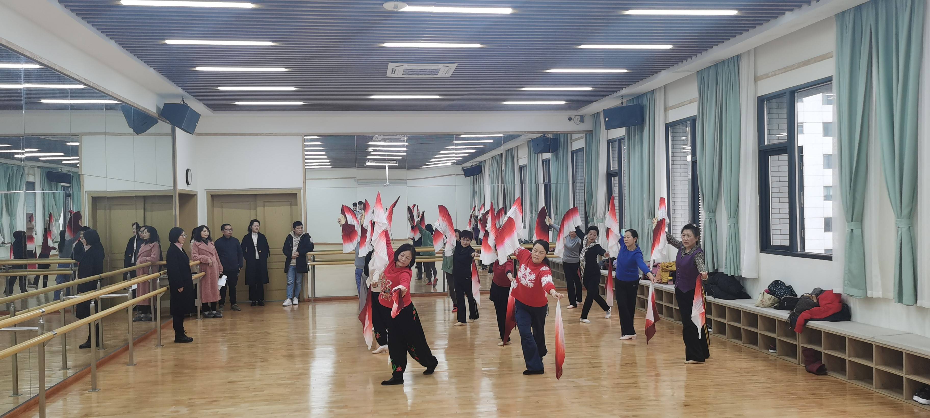 由贵州省社区教育指导服务中心副主任涂雪霏(主持工作)带领本部门教职工对节目进行审查,第四个节目是由2021民舞(2)班带来的舞蹈《红高粱》。进入A501舞蹈教室,出现在我们面前的是站着整齐的老年学员,其优美的舞姿,无不展现学员们对舞蹈的热爱。