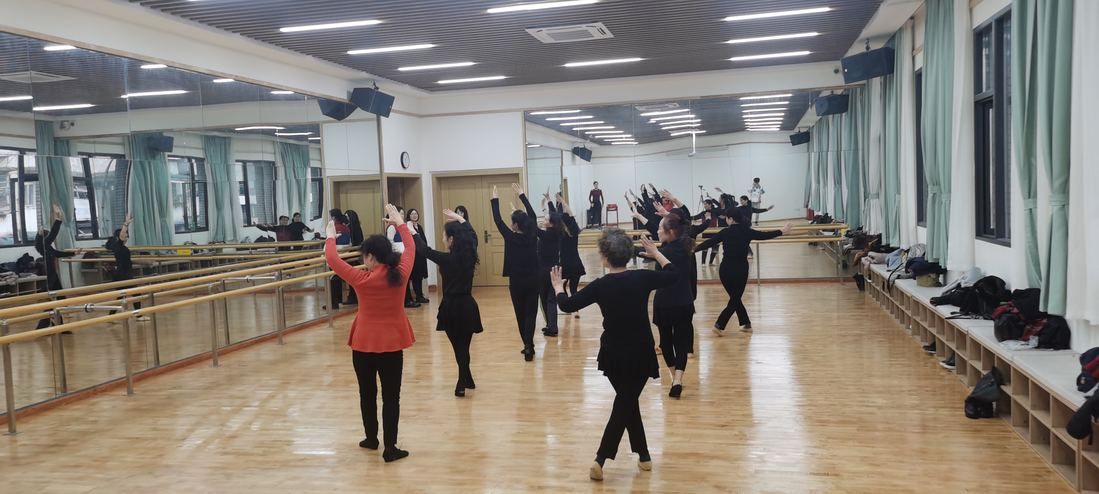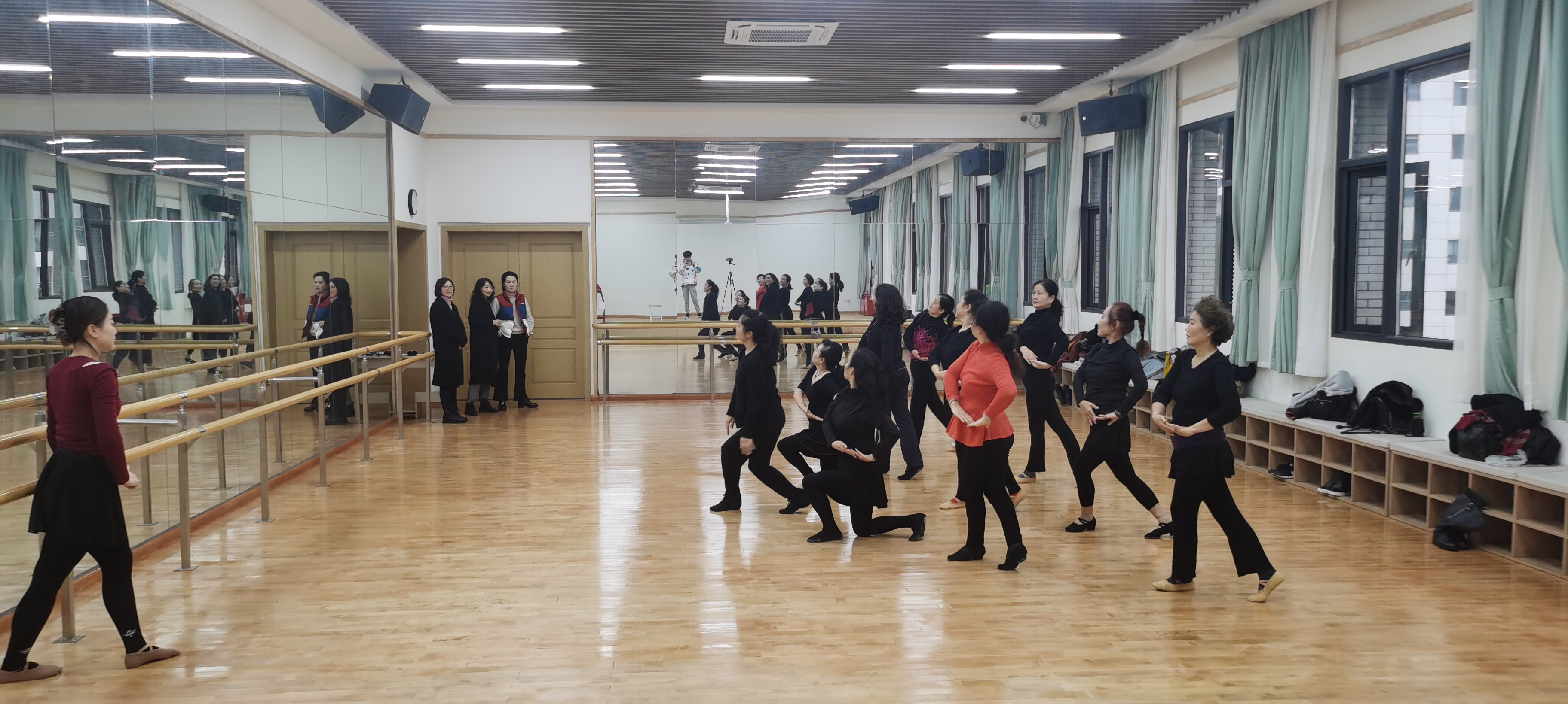 由贵州省社区教育指导服务中心副主任涂雪霏(主持工作)带领本部门教职工对节目进行审查,第六个节目是由2019民舞(1)班带来的《两座山》。进入A501教室,出现在我们面前的是 站着整齐的老年学员,其优美的舞姿,无不展现学员们对舞蹈的热爱。