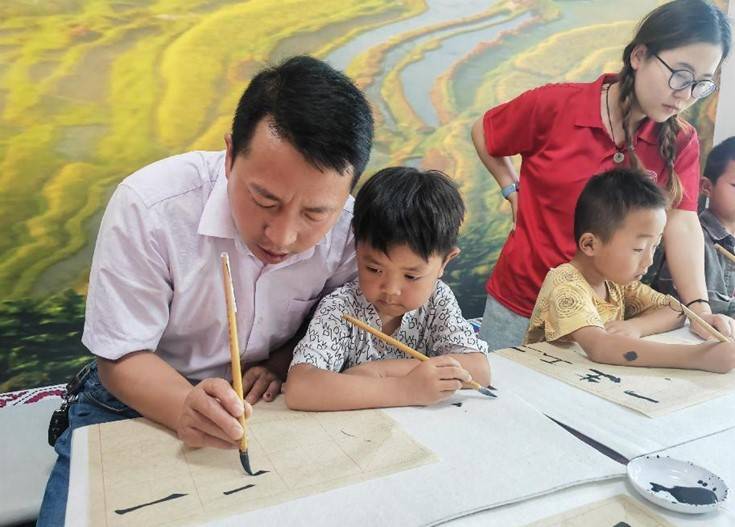 来自贵安新区开发投资有限公司、松林村驻村干部、广东省美术家协会会员的龙普志老师在悉心教小朋友们写书法、画中国画,他认为通过教孩子学习中国书画,一方面可以传承中国传统文化;另一方面国画讲究的是意境,通过笔墨抒发个人的感情,描绘美好的人生。学习中国画,可以慢慢地体现出真正的真善美,画中国画可以静心、静气、静神、养气质。可以培养他们不论在学习中还是生活中都能静心静气地做事。