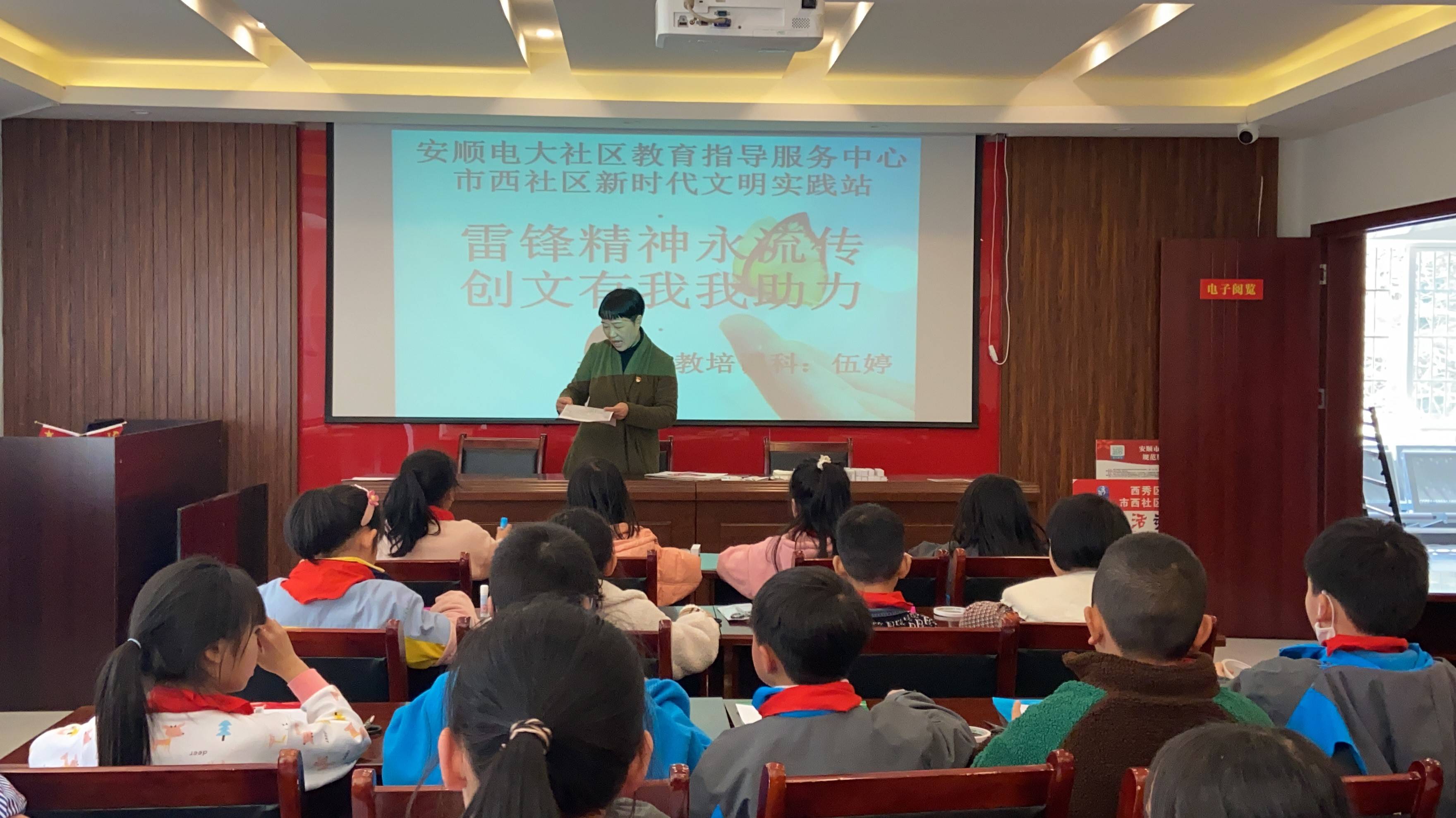 在活动中安顺电大电教培训科科长向未成年人介绍了雷锋的生平,讲述了雷锋的故事《苦练》,并和同学们进行了一个互动提问“如果你是雷锋你会怎么帮助需要帮助的人”,学生们积极的回答,有些要扶老年人过马路,有些要帮助家长做家务,有些会劝导文明出行......在活跃的气氛中给未成年人们宣传了创建文明城市工作的重要性,让青少年在创文中大力弘扬雷锋精神,引导和激励他们积极践行社会主义核心价值观,在无私奉献中体现作为、感悟成长,在道德实践中传播文明,积聚道德建设的正能量,“小手牵大手”在创建全国文明城市中积极行动,践行“雷锋精神永流传,创文有我我助力”。