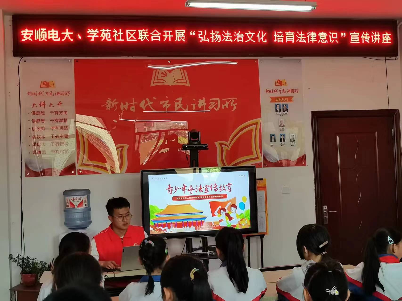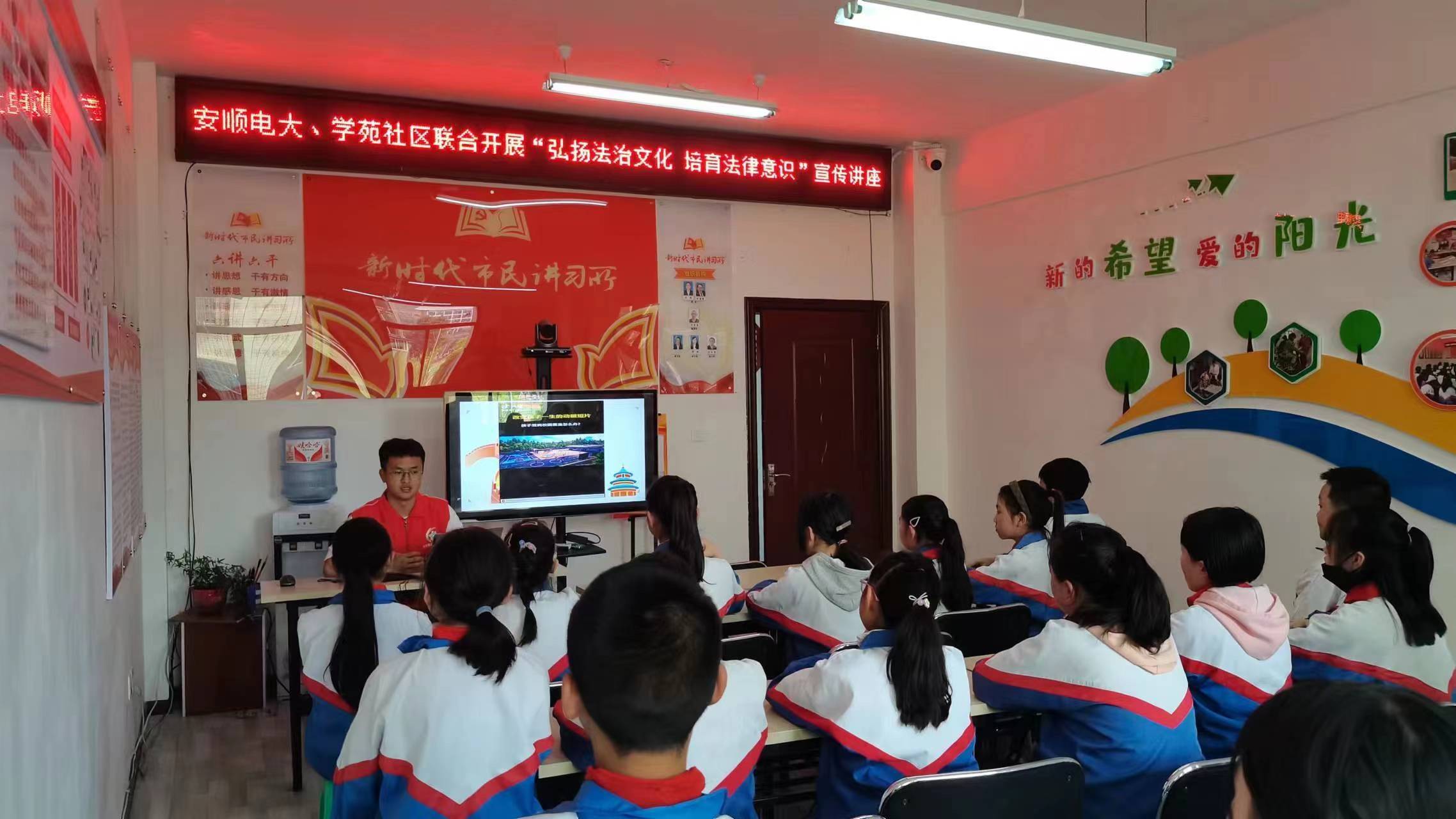 为了积极推进青少年法制教育工作,增强青少年法律意识和法制观念,提高他们明辨是非的能力、依法自我保护的能力和抵御社会不良影响、预防违法犯罪的能力,培养有理想、有道德、有文化、有纪律的“四有”新人,不断推动未成年人法治教育工作全面深入地开展。4月13日下午安顺电大社区教育服务指导中心到开发区学苑社区为社区龙井小学的部分学生开展 弘扬法治文化 培育法律意识为主题的法律宣传讲座。
