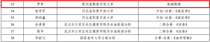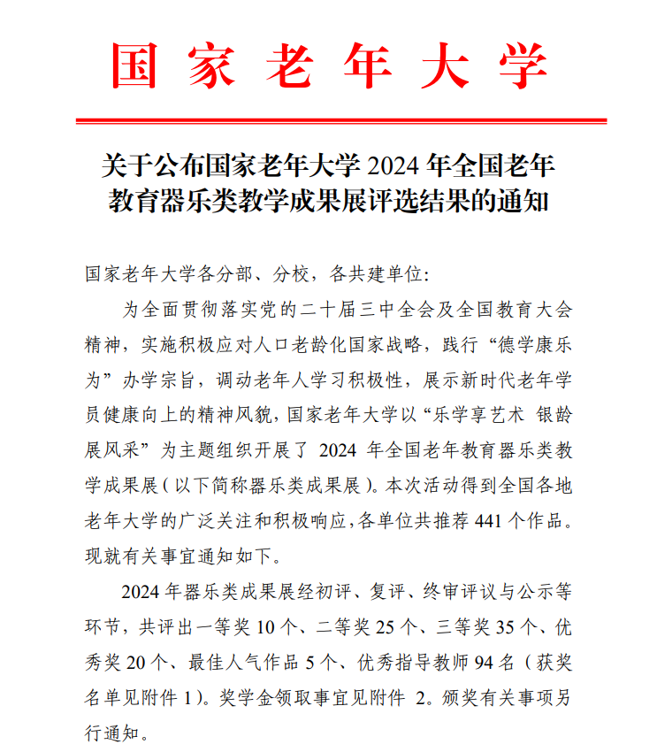 近日,国家老年大学以“乐学享艺术 银龄展风采”为主题组织开展了2024年全国老年教育器乐类教学成果展,在大赛评选结果中,我校选送的黔南开放大学节目《春城锦绣》荣获三等奖。