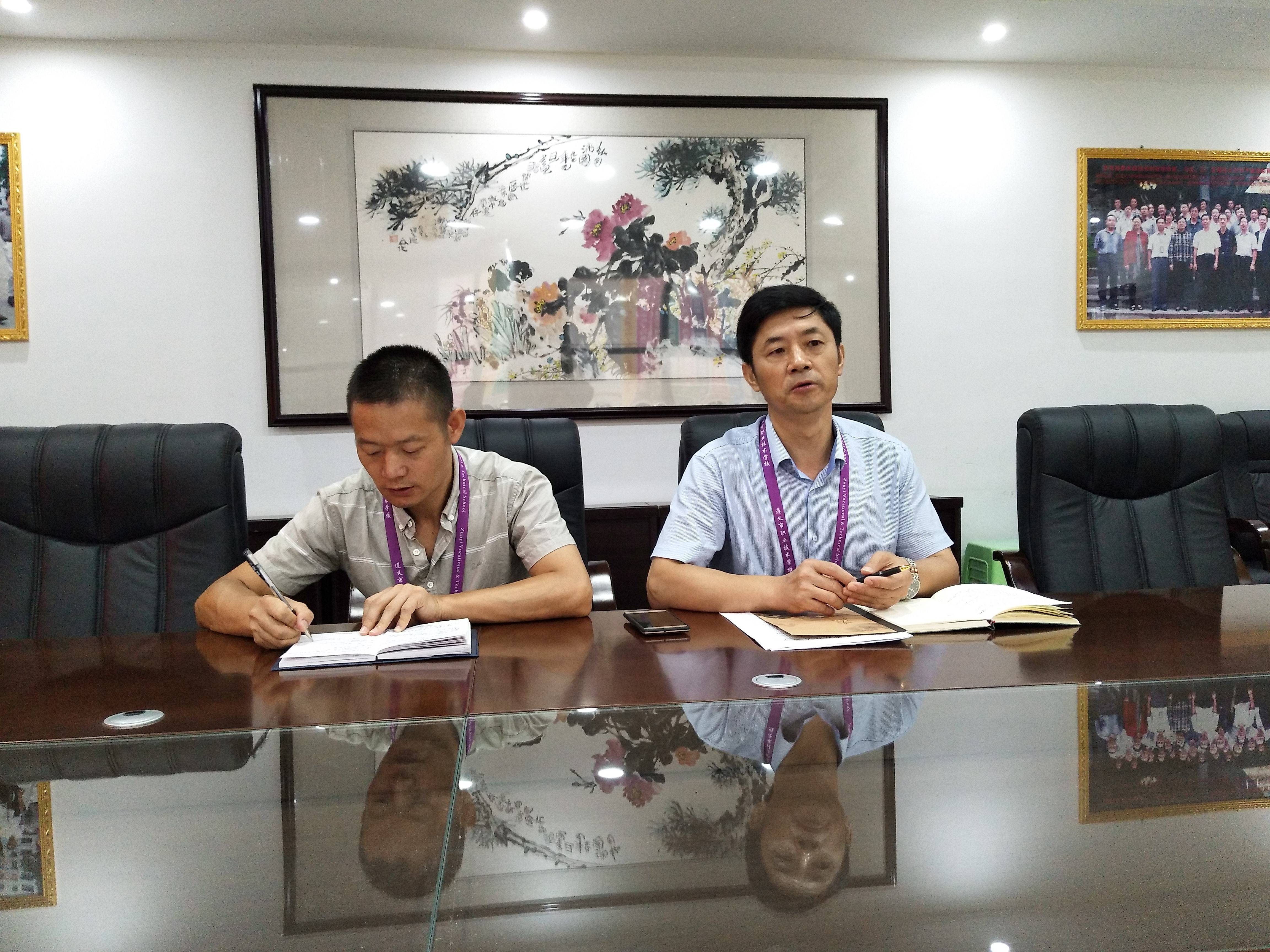 上午,天空明朗,空气清新。桐梓职校成教处成小英、向昌永一行驱车前往遵义市职业技术学校。在市职校会议室,遵义市职业技术学校副校长肖泉和张后方主任,与我们一起分享了社区教育经验交流。
