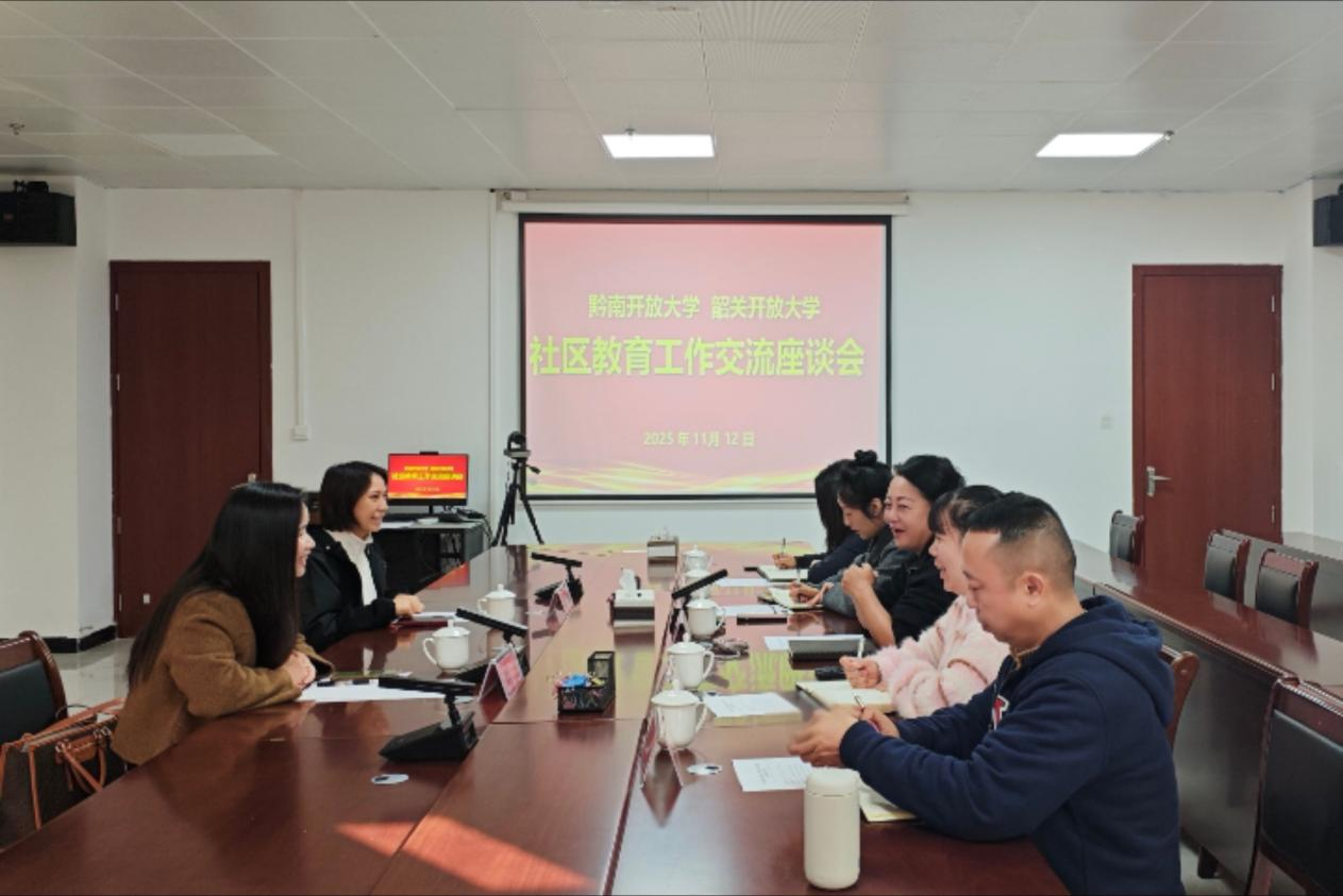 2025年11月12日,黔南开放大学与韶关开放大学在黔南开放大学党委会议室成功举行社区教育交流座谈会,韶关开放大学社区教育科科长刘金、韶关开放大学社区教育科教师陈玉梅,黔南开放大学副县长级干部、社区教育与社会培训科负责领导黄雯及科室各成员出席会议。