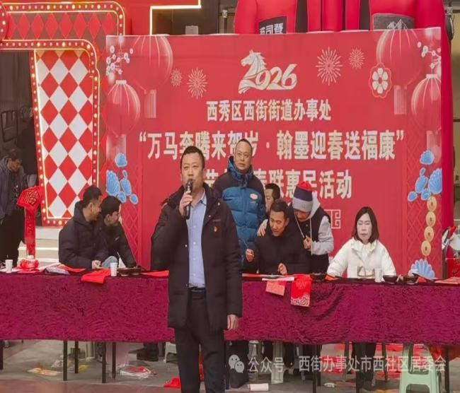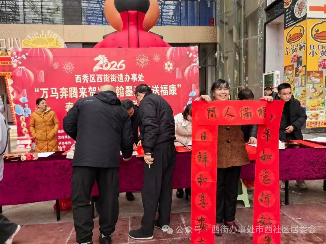 2026年2月9日下午15:00,西街街道办事处在安顺国贸购物中心广场举办“万马奔腾来贺岁,翰墨迎春送福康”写春联、送福字主题活动。本次活动以笔墨为桥,由安顺开放大学、安顺市新华书店有限公司、西街街道办事处联合主办,安顺国贸责任有限公司、西街街道市西社区共同承办,为居民送上满满的新春祝福与文化暖意。