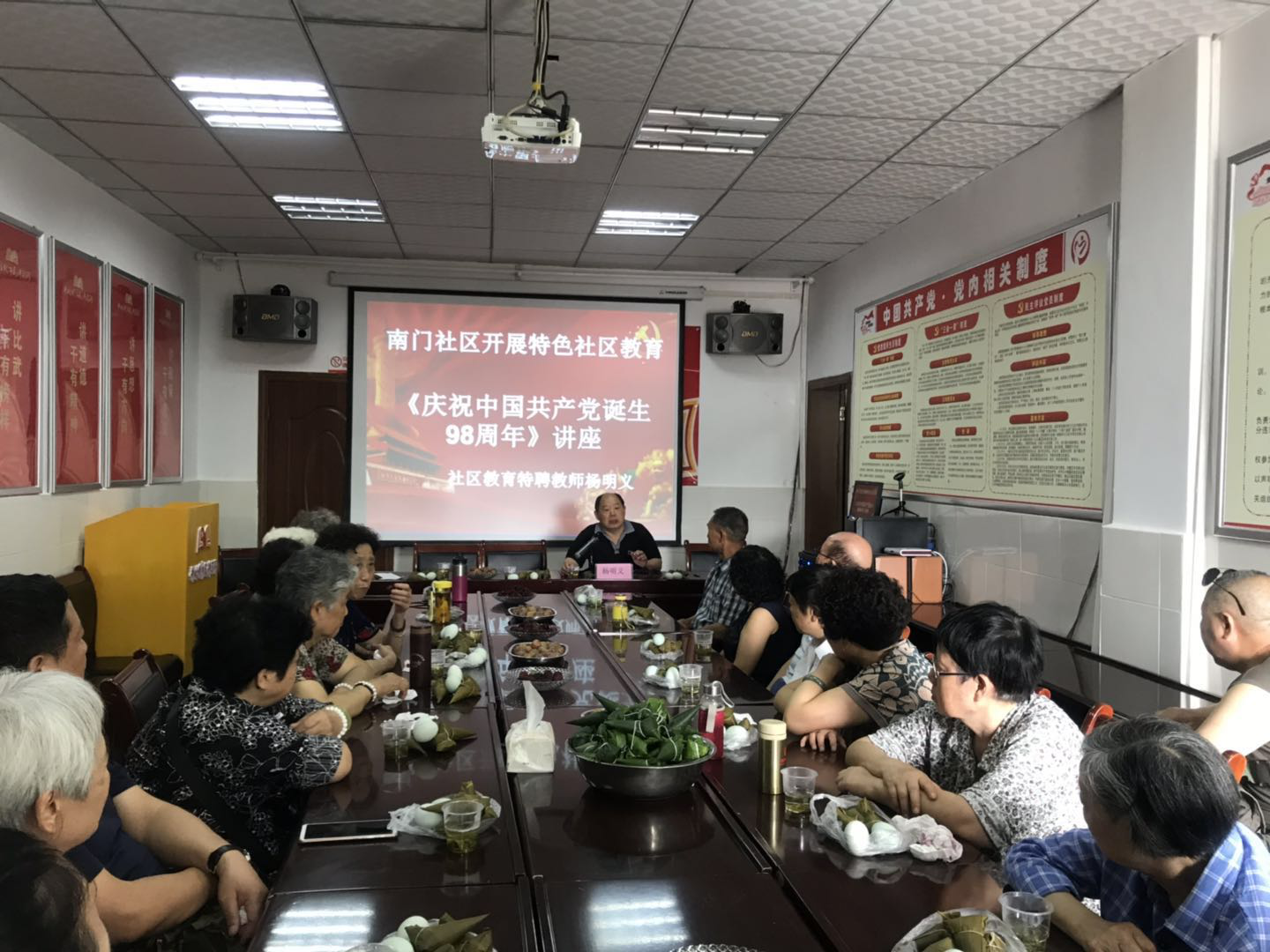 社区教育特聘教师杨明义同 志为大家上党课《庆祝中国共产党诞生98周年》。党史为主线的党课,杨老师跟党员共同学习了中国共产党党史。号召党员要加强学习,从保持先进性学习上下功夫,提高自身素质;要发挥自身特长,关心帮助困难党员,在社区能够有所作为。通过党课宣讲,社区党员们进一步增进了爱党之情、恪尽兴党之责,引导激励社区党组织和党员发挥战斗堡垒和先锋模范作用,推动社区 各项工作再上新水平。