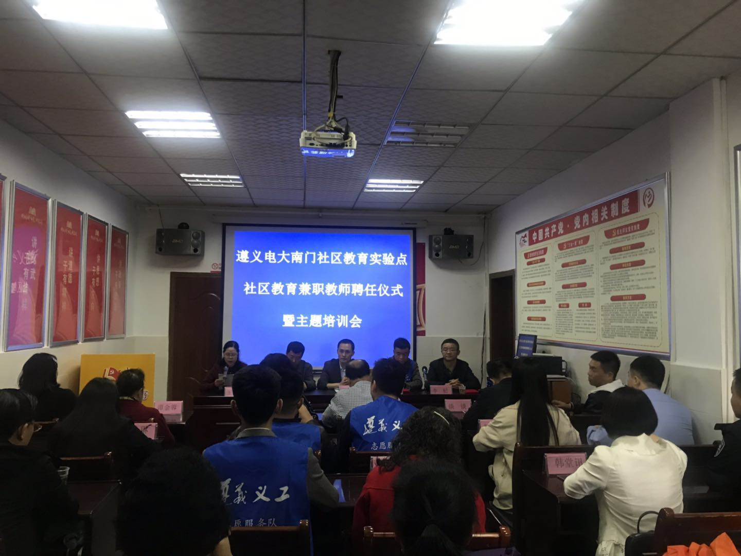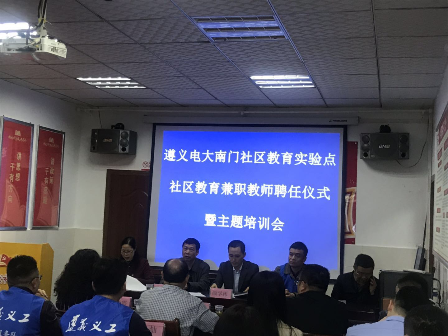 为了更好地实现党建引领基层社区治理,让社区教育在基层社区发挥更大的影响力和作用力,遵义电大于2019年4月30日携手南门社区试验点举行首批社区教育试验点兼职教师聘任仪式暨主题培训会。遵义电大校长朱健、遵义义工联合会会长卓先顺、遵义市广播电视大学教务处处长、社区办负责人李杞、遵义市老城小学党支部书记胡隆霞、老城街道办事处党工委副书记颜学彬、遵义名城律师事务所律师谈谈等相关领导出席会议。