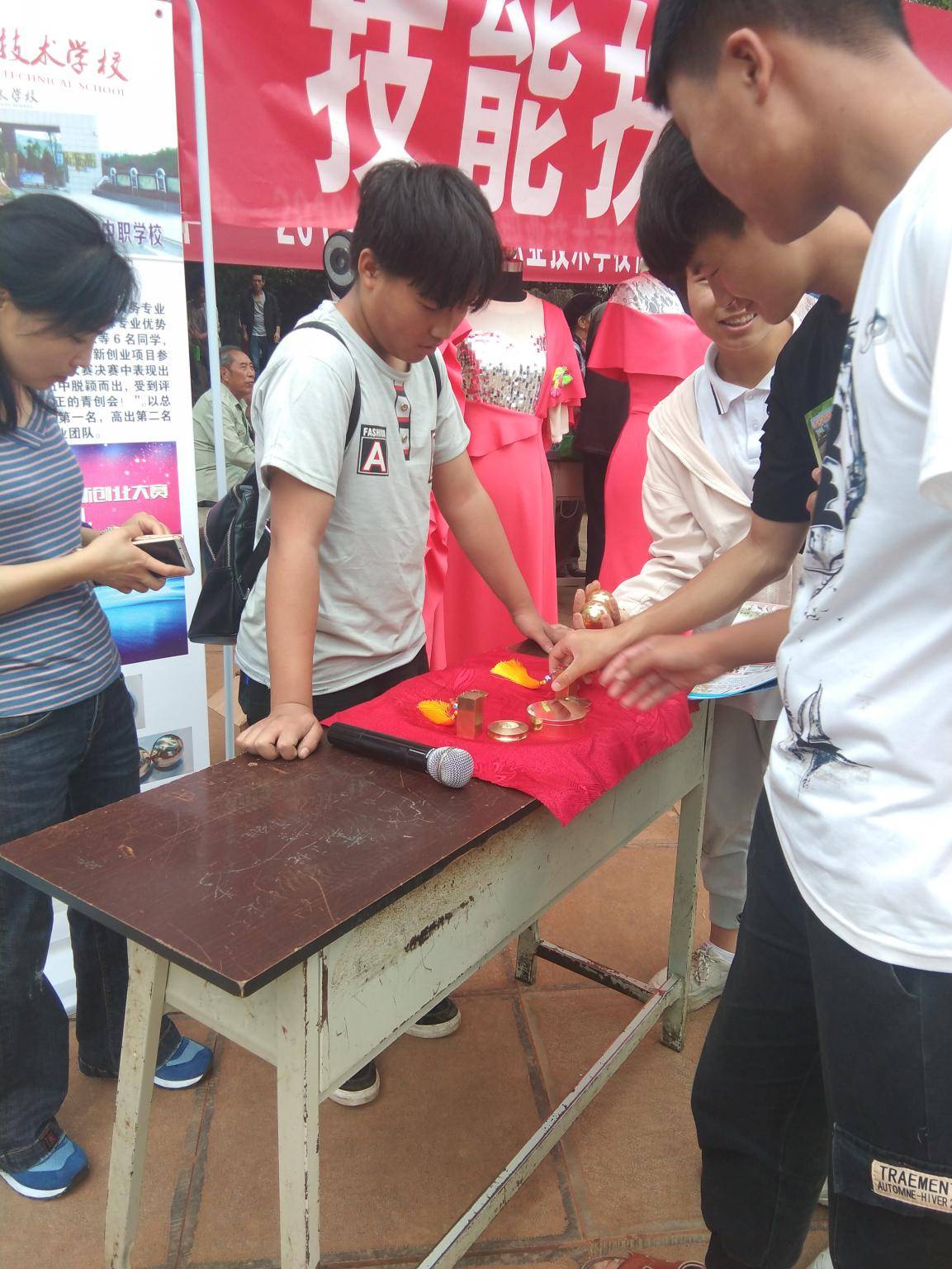 社区教育负责人及工作人员、医药卫生系、机电工程系、服装工程系的部分老师和学生共30余人参加了本次宣传活动,医药卫生系的血压测量;机电工程系的学生作品印章、砚台、健身球、镇尺等;服装工程系的服装展示深受广大社区居民的欢迎。