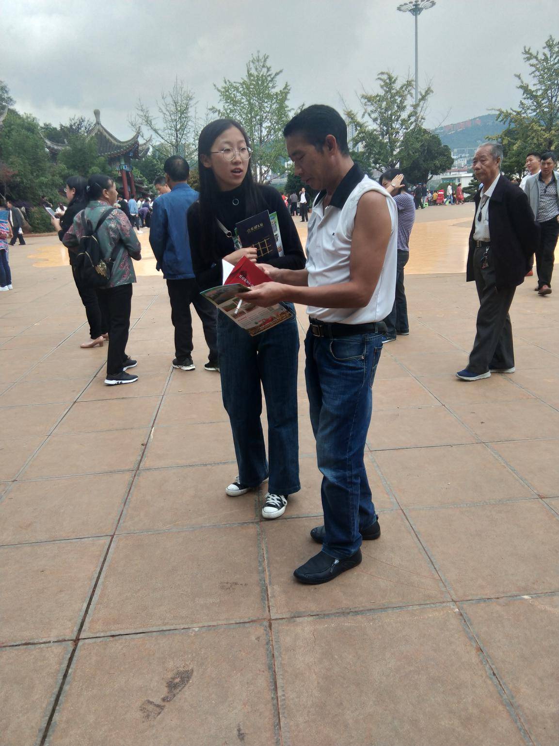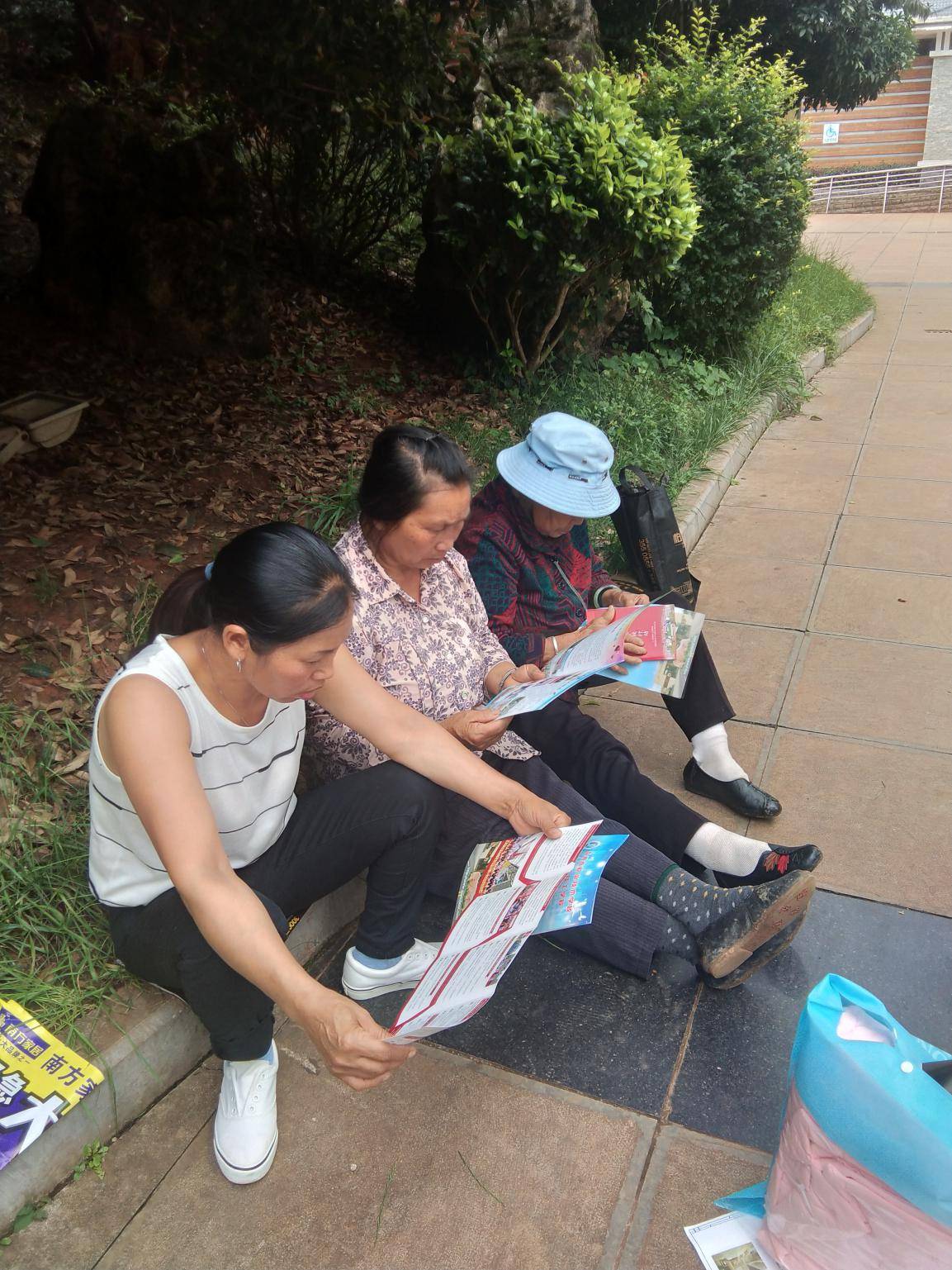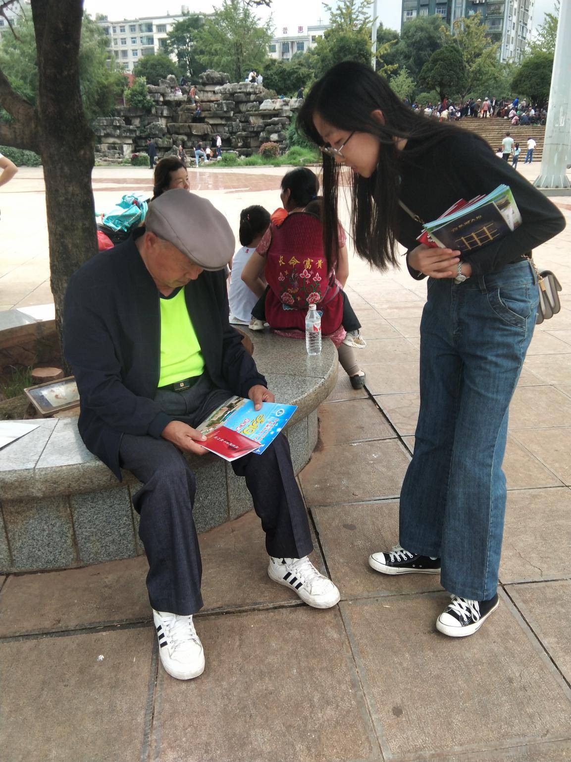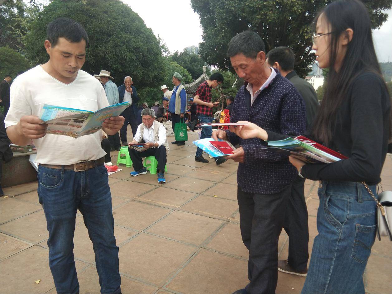 社区教育工作人员正在给社区居民发放宣传册并进行政策宣传
