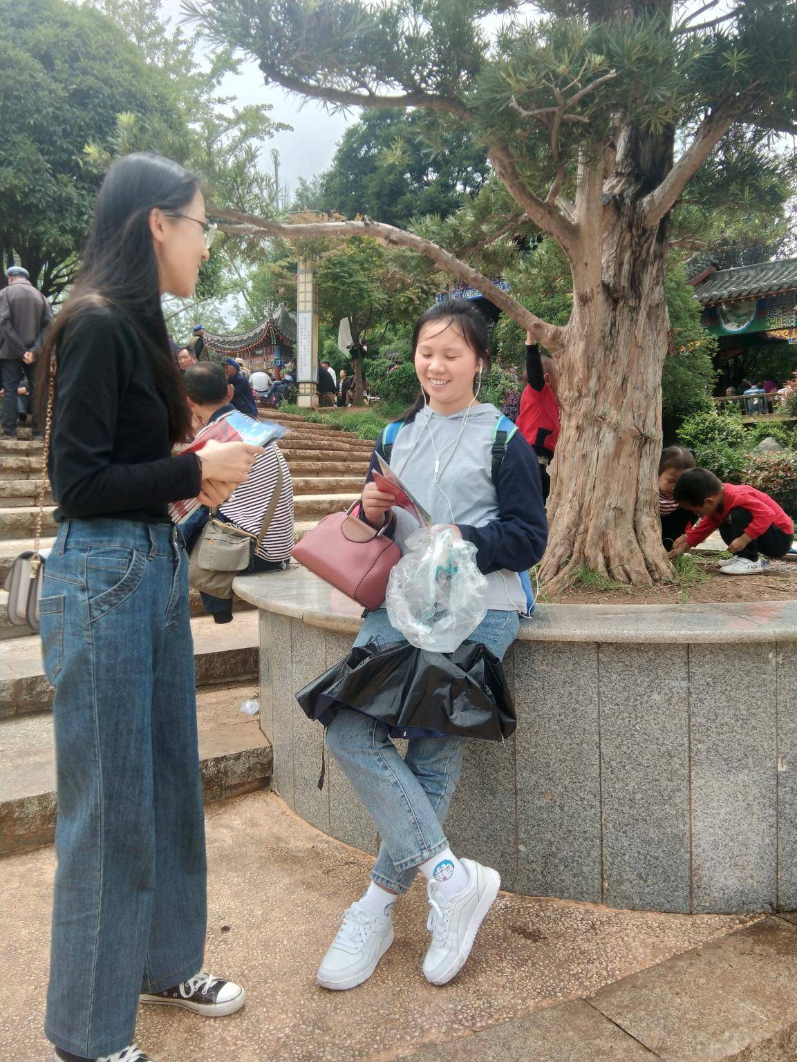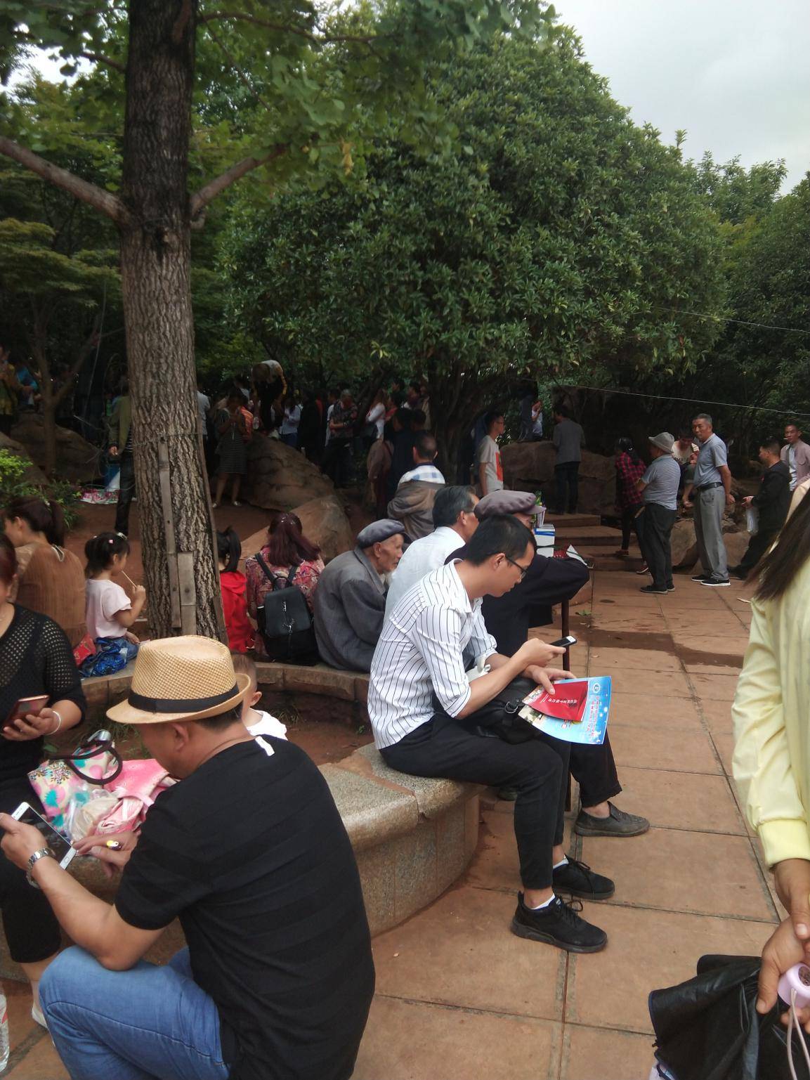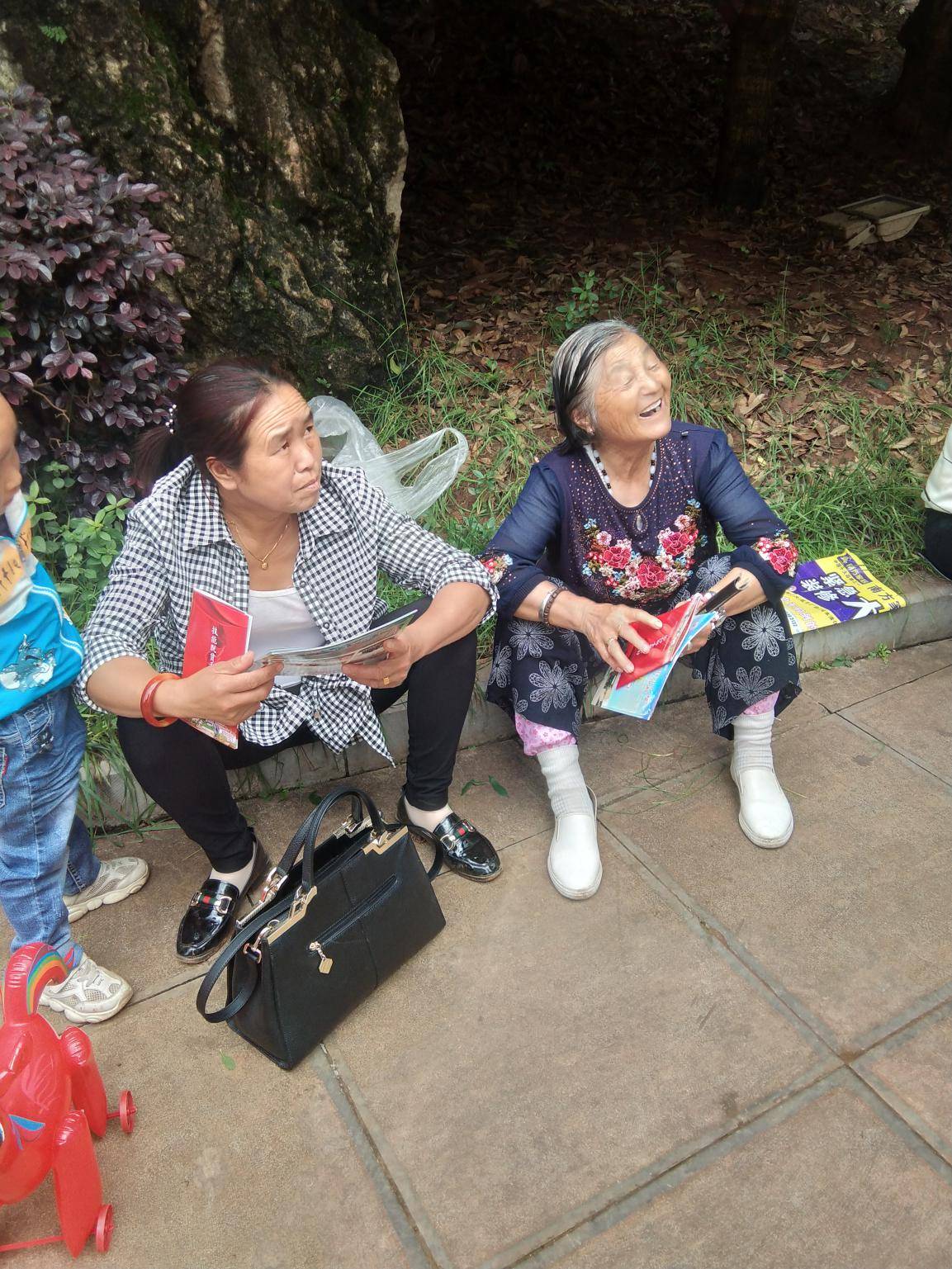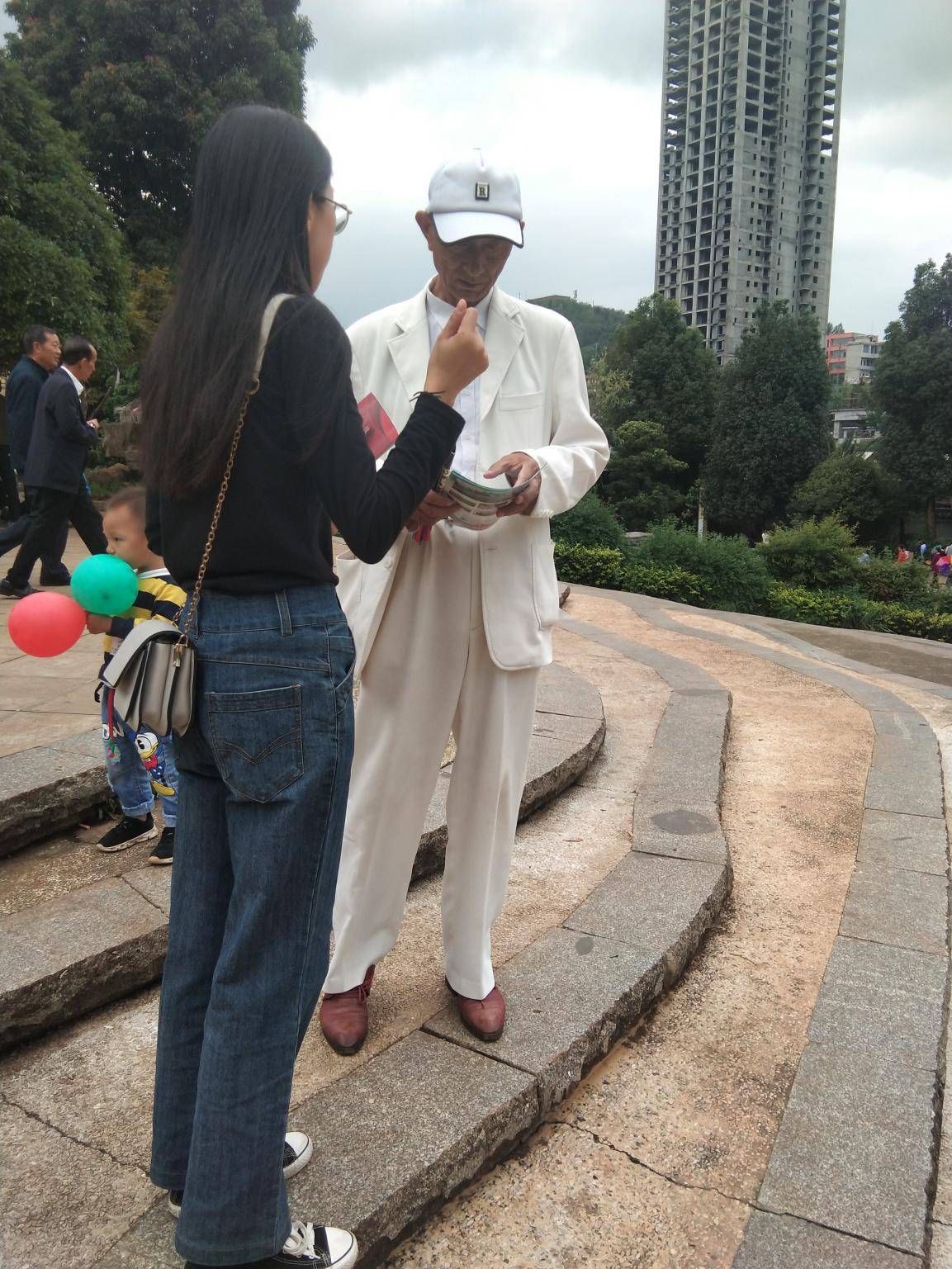 社区教育工作人员正在给社区居民发放宣传册并进行政策宣传