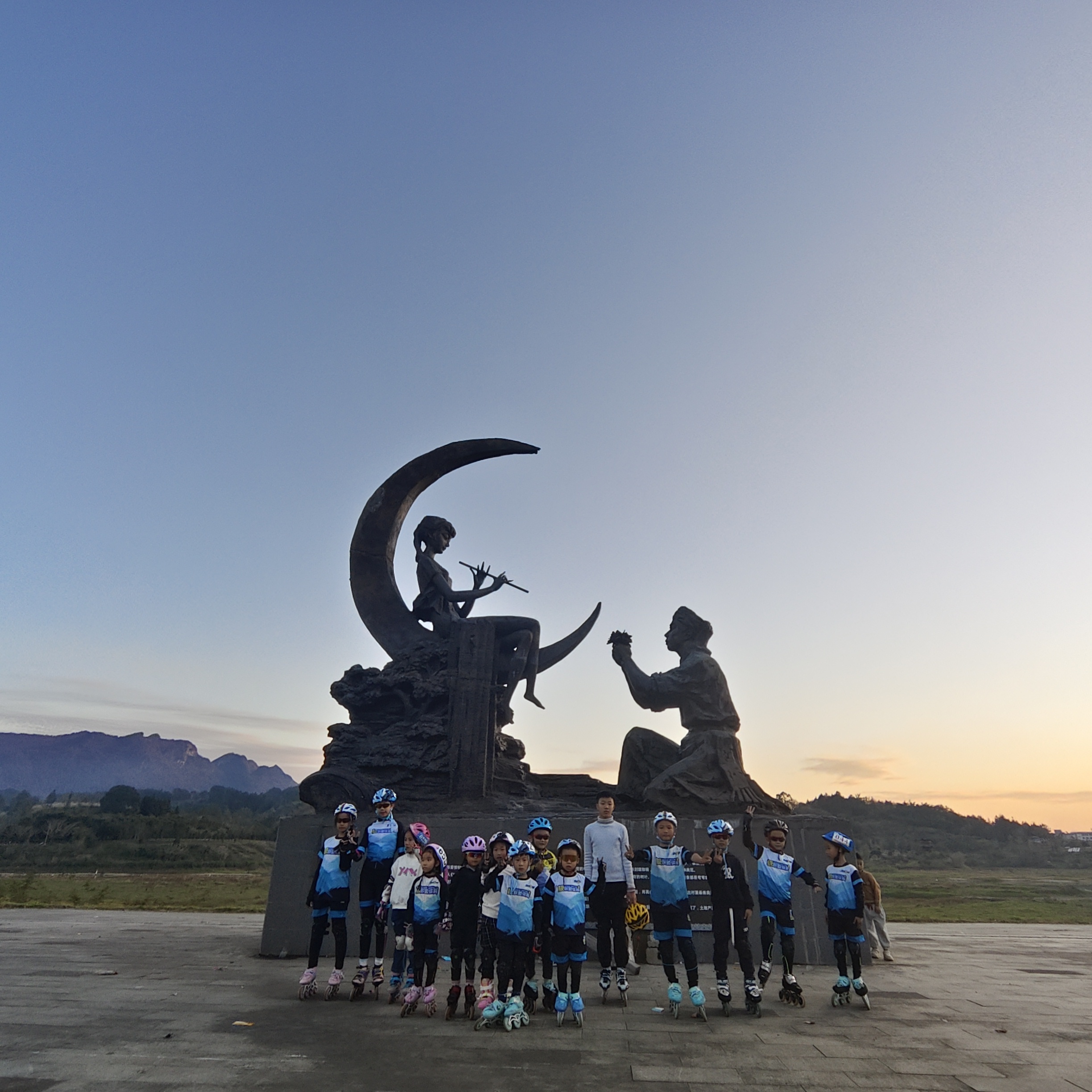 轮滑小队的山野日落局[emoji] 公路上列队的小身影,是风也追不上的少年气✨ 月亮雕塑下的合影,把今天的快乐都封存在晚风里[emoji]