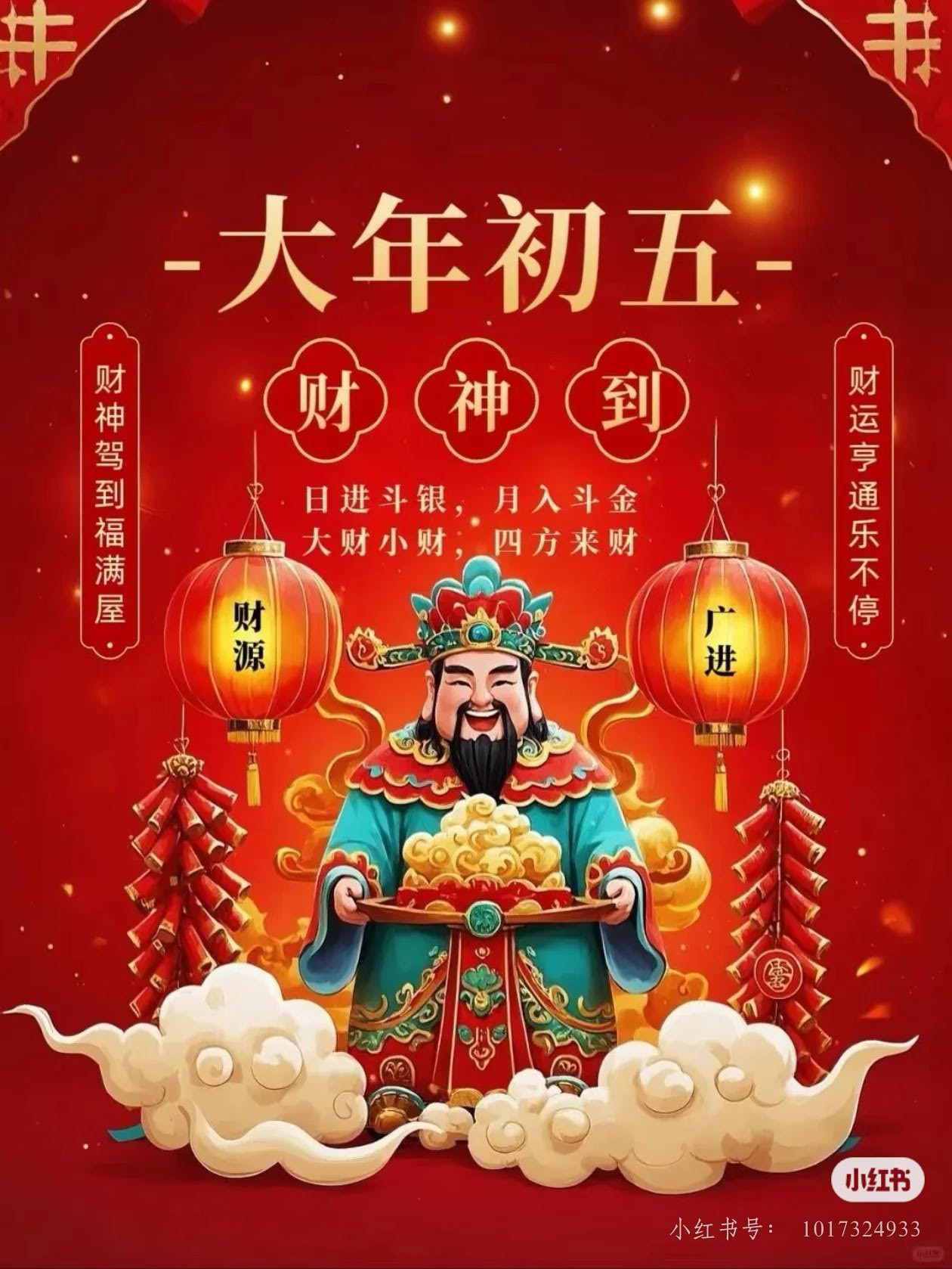 正月初五,恭迎五路财神。 五路财气,齐进门庭。 愿你我2026 年年富足事事顺,四季财源福满门。 发财,被爱,好运常在²⁰²⁶。