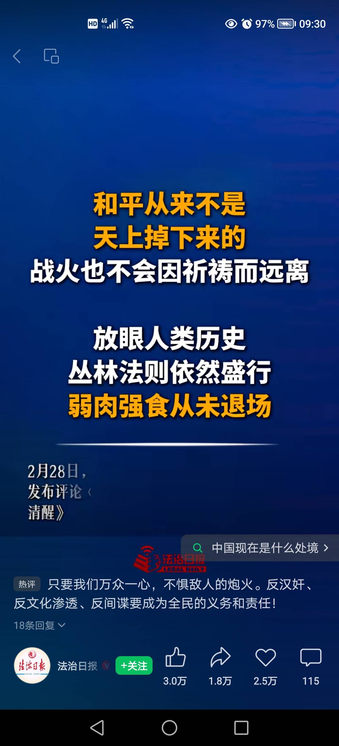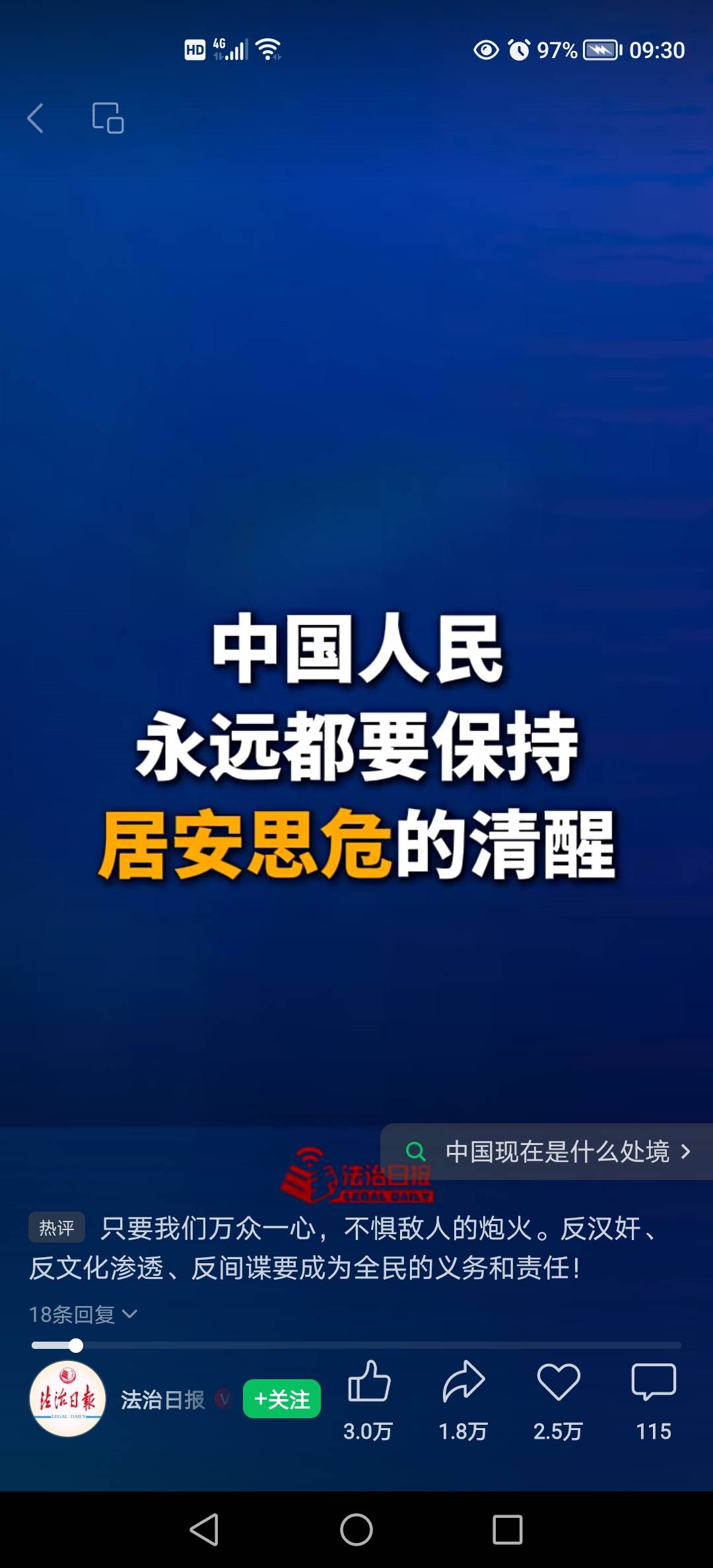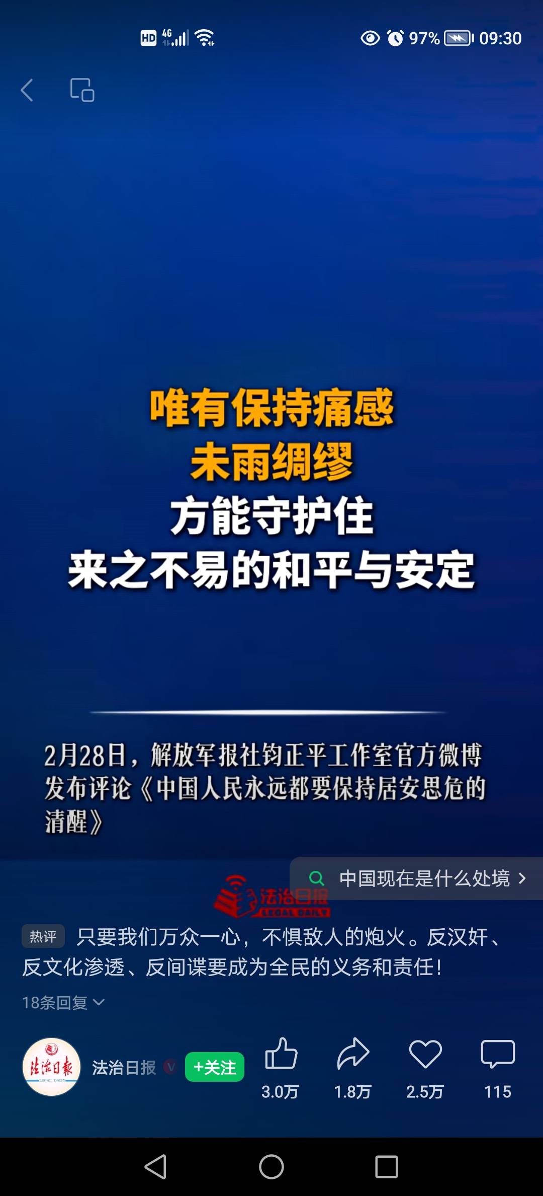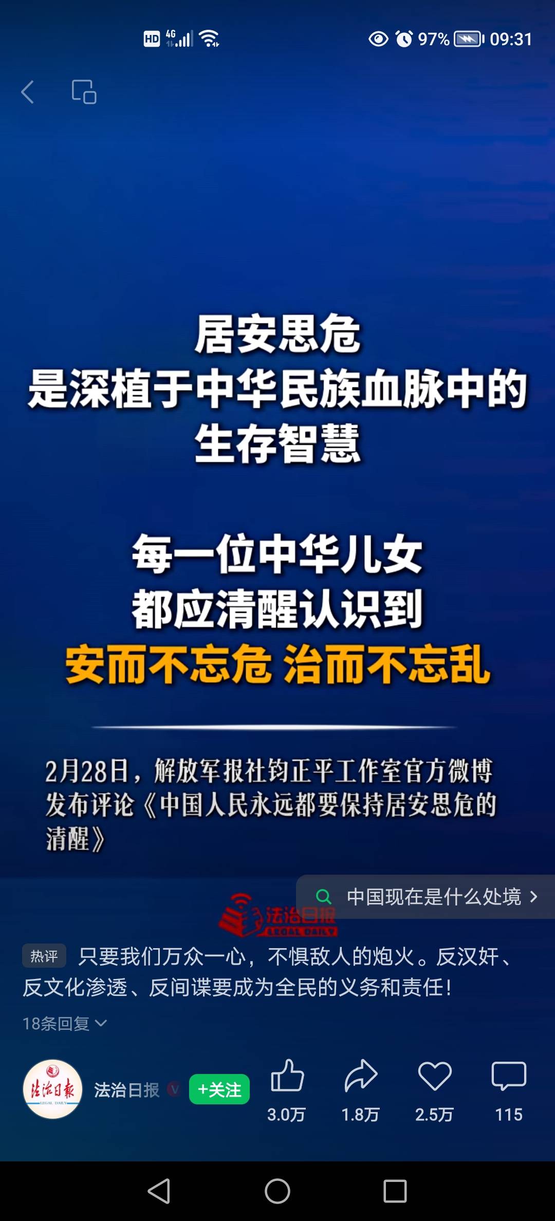 中国人民永远都要保持居安思危的清醒